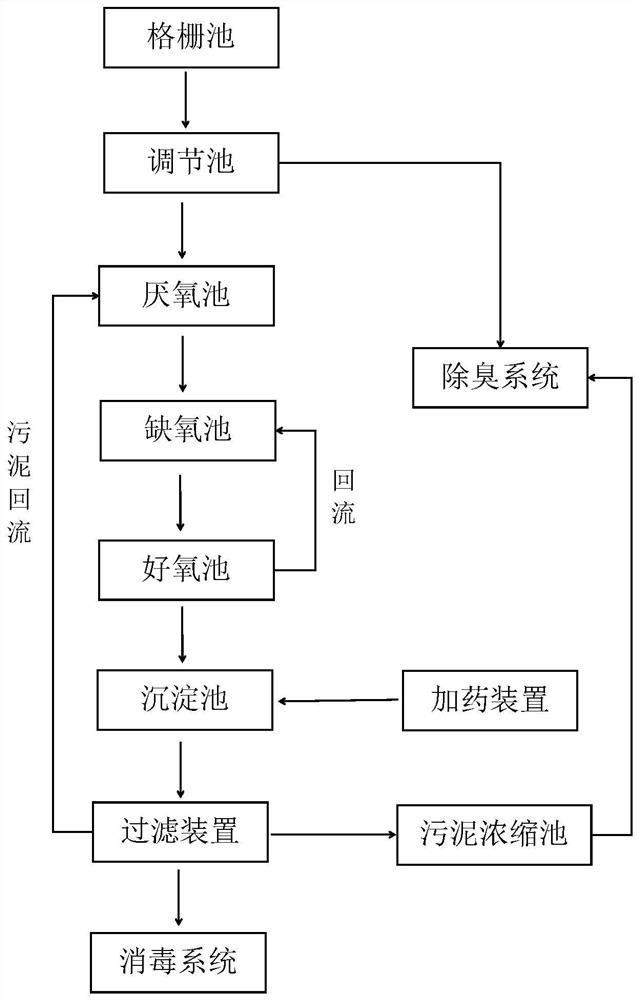 MBBR工艺的污水处理装置,包括格栅池、调节池、一体化MBBR设备、污泥浓缩池、过滤装置、消毒系统;一体化MBBR设备主要由依次连通的厌氧池、缺氧池、好氧池和沉淀池组成,好氧池内有悬浮填料,好氧微生物生长在悬浮填料上形成微生物膜;好氧池的一部分出水进入沉淀池,另一部分出水回流至缺氧池;沉淀池的清水进入过滤装置,底部的污泥一部分排入污泥浓缩池,另一部分回流至厌氧池;调节池进水口与格栅池出水口连通,调节池出水口连通至厌氧池;过滤装置安装于沉淀池出水端,过滤装置的清水进入消毒系统,底部的污泥排入污泥浓缩池。利用上述系统进行污水的处理,工艺流程简单易操作,占地面积小且处理效果优异。